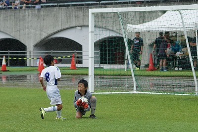 初戦は同じ多摩市のトヨニさん。北貝と同じく3.4年もヘルプに入っての混合チーム。キックオフ直後からものすごい豪雨。ボールも止まるし選手も滑るしで四苦八苦。しかし第一ピリオドでゴール前でGKの弾いた所をルイが良く詰めて先制!さらに前線にあがったユウマがミドルを打ち込み2点目。第二ピリオドでも危なげない試合で1点リードのまま第三ピリオドでも良く攻め込むが得点にならず、終了間際に失点してまい2-1で試合終了。